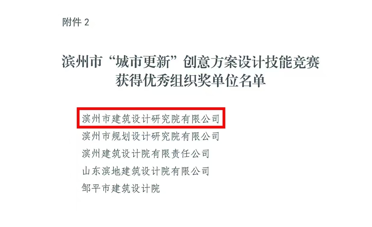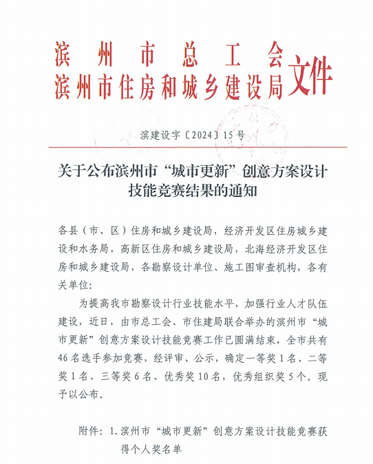 2024年10月,在濱州市總工會、濱州市住房和城鄉(xiāng)建設(shè)局共同主辦,濱州市勘察設(shè)計(jì)協(xié)會、濱州建筑工程施工圖審查中心承辦的濱州市“城市更新”創(chuàng)意方案設(shè)計(jì)技能競賽中,公司員工憑借出色的創(chuàng)意和專業(yè)的技能脫穎而出,參賽的9名員工全部獲獎(jiǎng),囊括一、二等獎(jiǎng),另外3人獲三等獎(jiǎng),4人獲優(yōu)秀獎(jiǎng),公司獲得優(yōu)秀組織獎(jiǎng)。本次競賽活動(dòng)主題為“聚力創(chuàng)新發(fā)展,賦能強(qiáng)市建設(shè)—濱州市城市更新設(shè)計(jì)探索”。